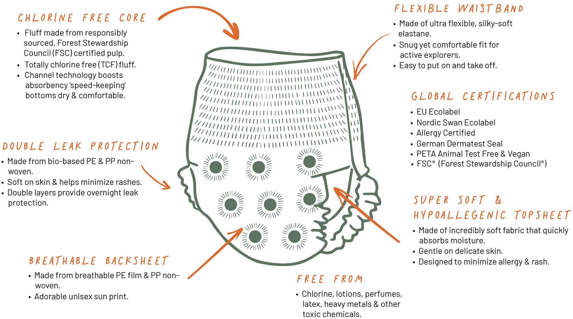 - Fluff made from responsibly sourced, Forest Stewardship Council (FSC) certified pulp. Totally chlorine free (TCF) fluff. Channel technology boost absorbency speed - keeping bottoms dry & comfortable.