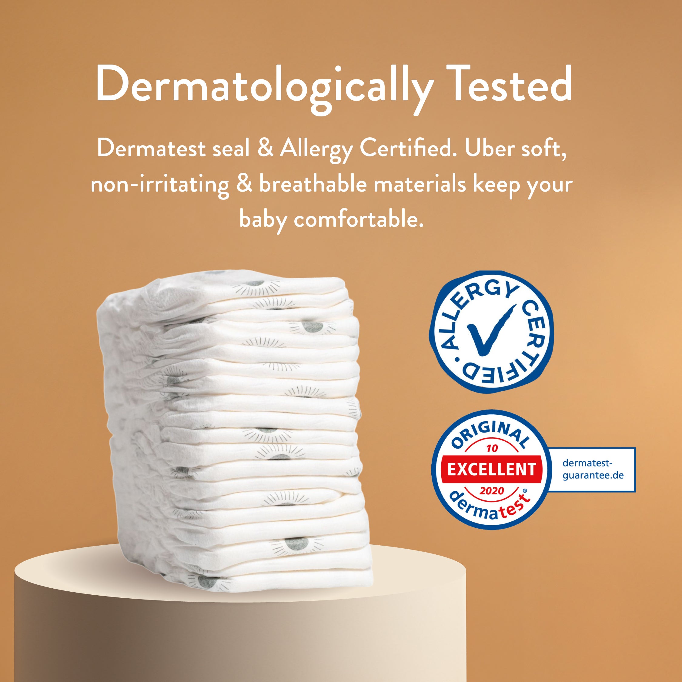 The Dermatest seal & Allergy Certification confirm our pull-ups passed rigorous testing on sensitive skin. Uber soft, non-irritating & breathable materials keep your baby comfortable.