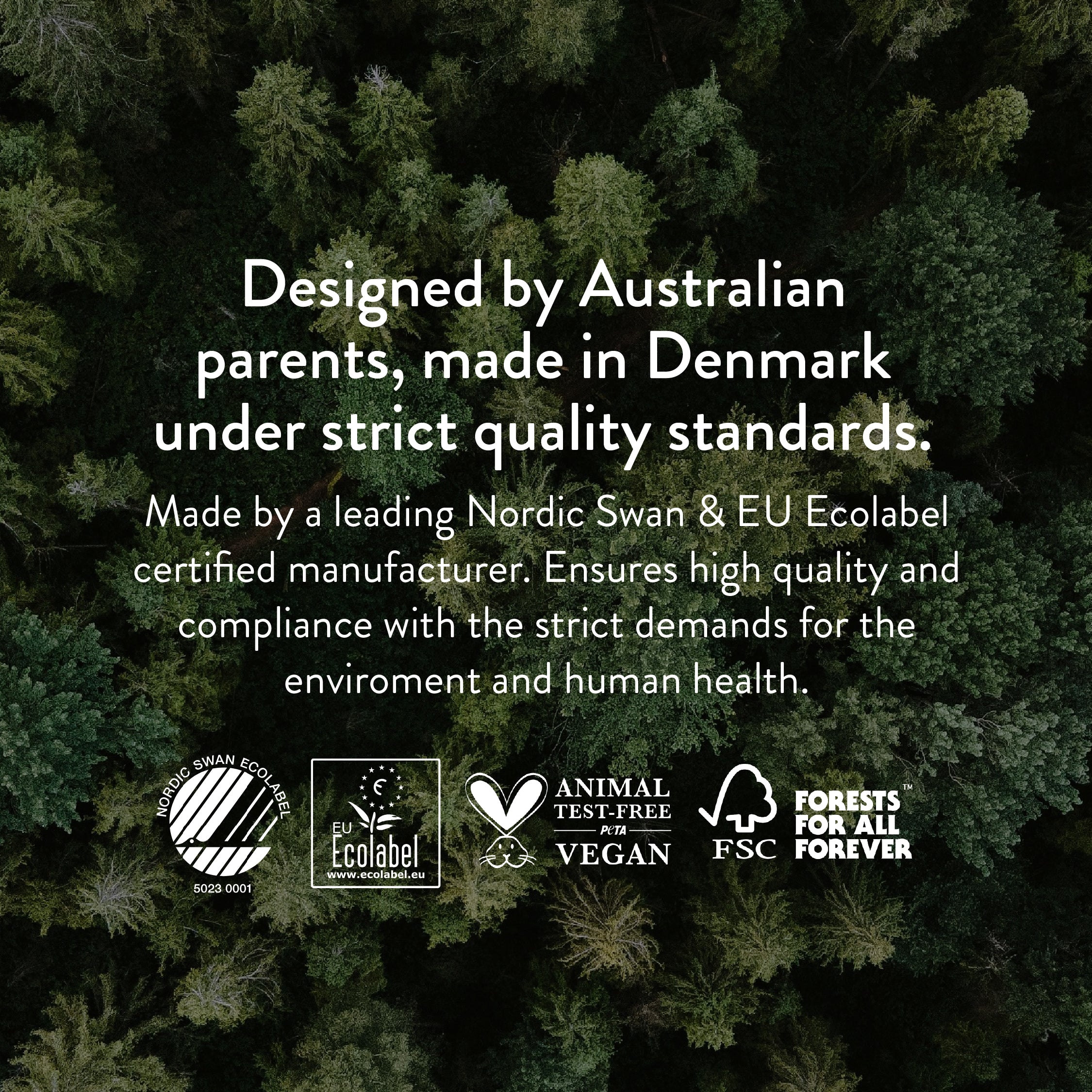 Totally free of chlorine, parabens, latex, phthalates, perfumes & heavy metals. Hypoallergenic materials make our subscription pull-ups ideal for sensitive skin. Reliable Danish manufacturer.