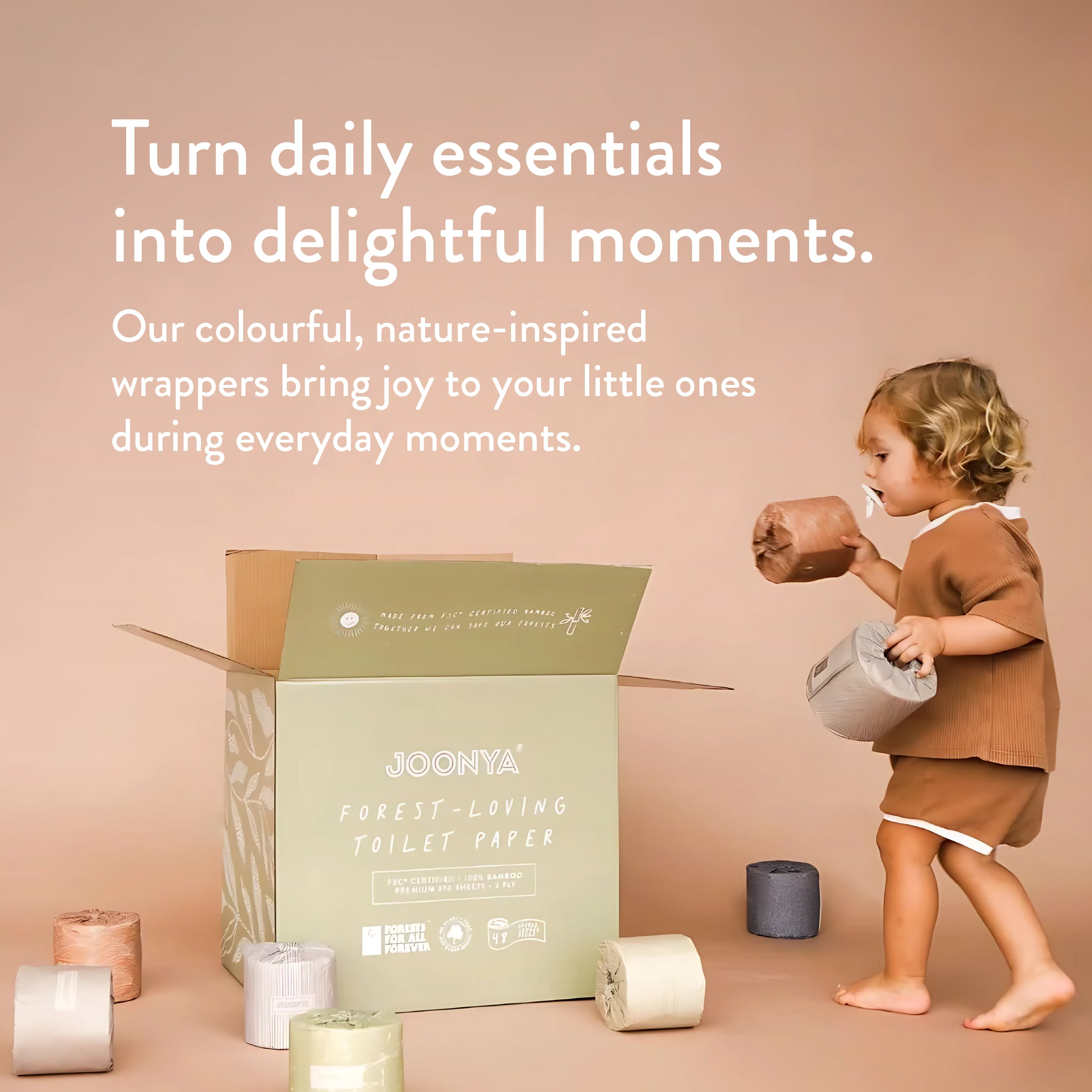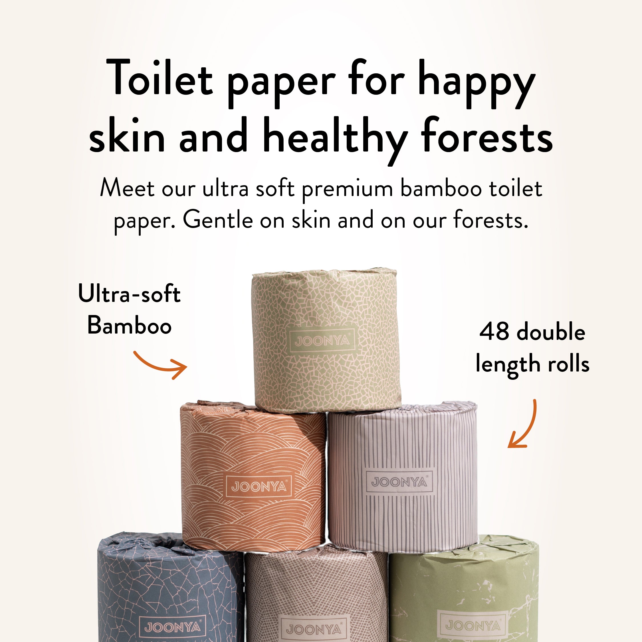 Joonya’s forest-friendly bamboo toilet paper is as gentle on your family’s skin as it is on our world's forests. Our ultra strong toilet paper features double length rolls to last you twice as long, with 370 soft 3ply 4" x 4" sheets. Available in 6 stunning eco-luxe biodegradable wrappers, these aesthetic toilet rolls are designed to be showcased and will enhance any bathroom décor or colour palette.